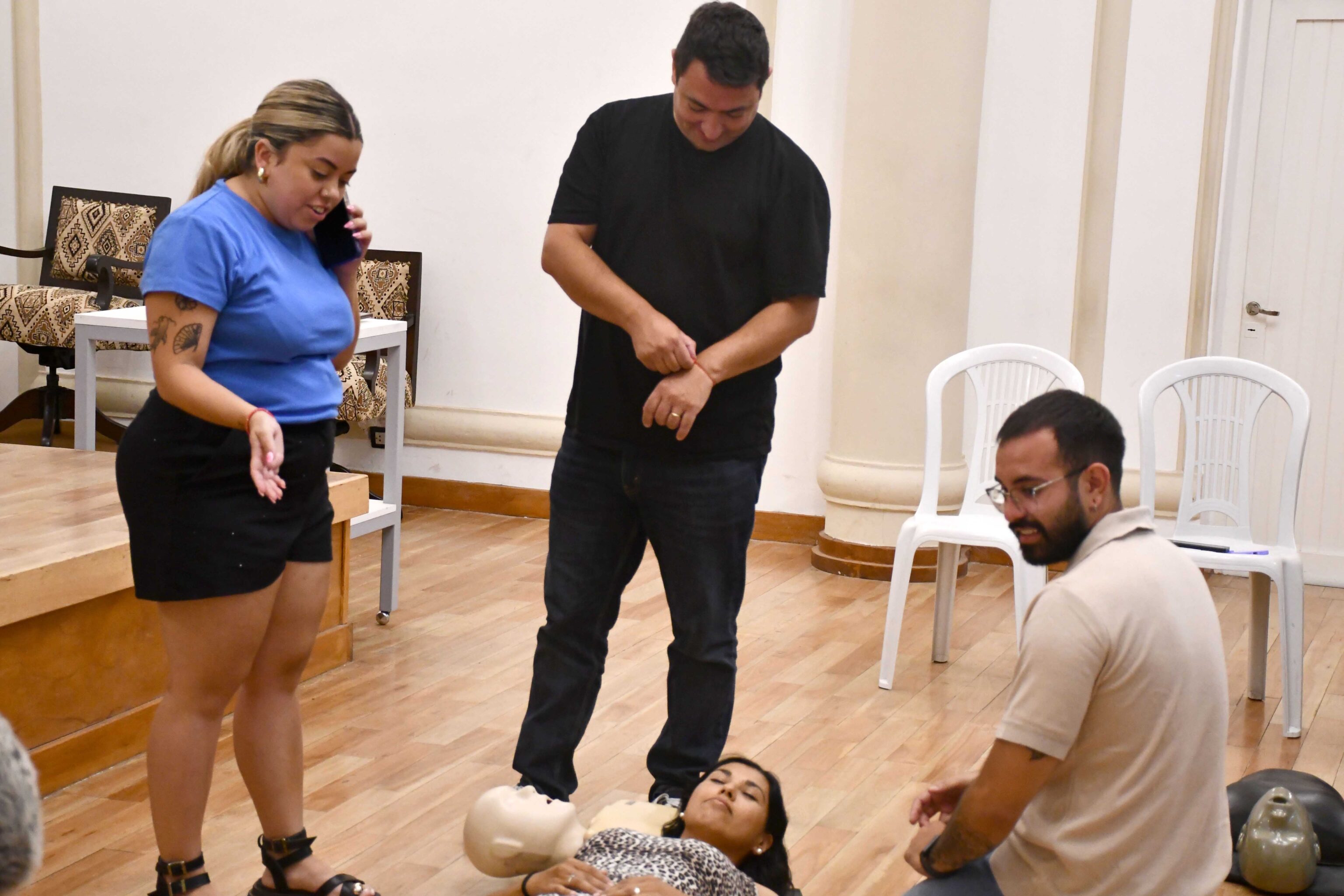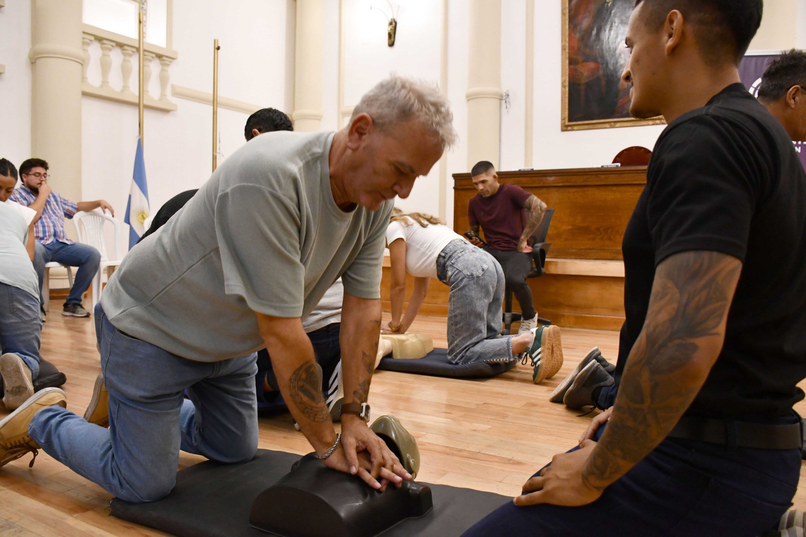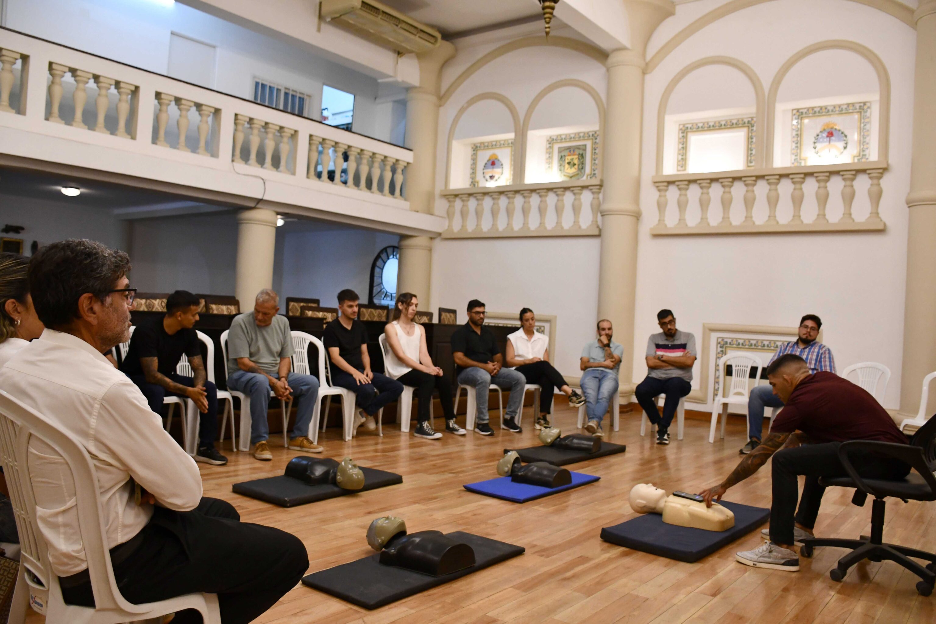 El primer encuentro estuvo orientado al reconocimiento, activación y maniobras fundamentales de vida. El profesor Juan Pablo Vallone abordó, de manera dinámica, temáticas como gestión del caos y liderazgo en la emergencia, mitos y realidades de este tipo de situaciones, actualización 2025 del protocolo y técnicas correctas de RCP (Reanimación cardiopulmonar) y maniobra de Heimlich (destinada a auxiliar a una persona en situación de ahogo). Además, los presentes pudieron realizar simulacros de ambas prácticas.